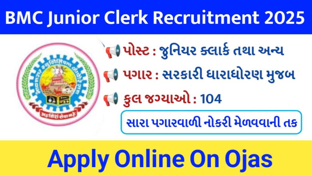 Bhavnagar Municipal Corporation (BMC) has announced recruitment for various departments. This recruitment will be done through direct recruitment (BMC Clerk Recruitment 2025) and this is a great opportunity for eligible candidates to get a government job in Bhavnagar city.