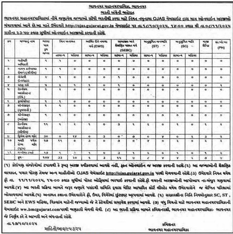 Bhavnagar Municipal Corporation Recruitment (OJAS BMC Bhavnagar Recruitment) includes the following posts:
